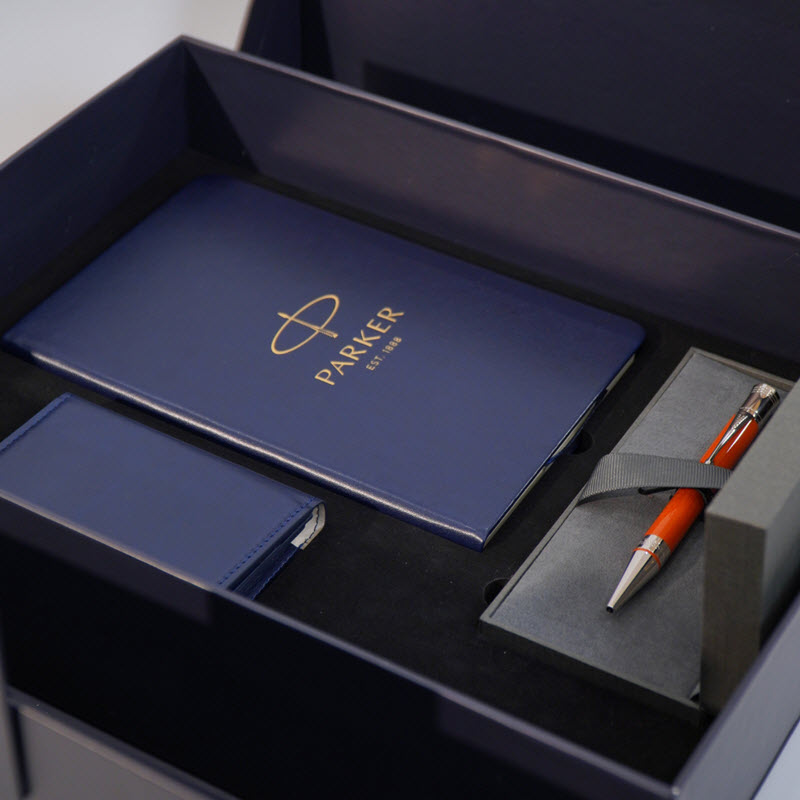 Được kết hợp hoàn hảo cùng sổ da – ví da – hộp và túi hãng Parker, bộ quà Giftset Parker mang đến trải nghiệm đẳng cấp, sang trọng và giàu giá trị sử dụng. Đây là món quà lý tưởng để tri ân khách hàng, tặng lãnh đạo, đối tác quốc tế hoặc dành tặng nhân sự xuất sắc. Tông màu bộ quà là đen – xanh navy, hài hòa, lịch thiệp và phù hợp với mọi môi trường doanh nghiệp.