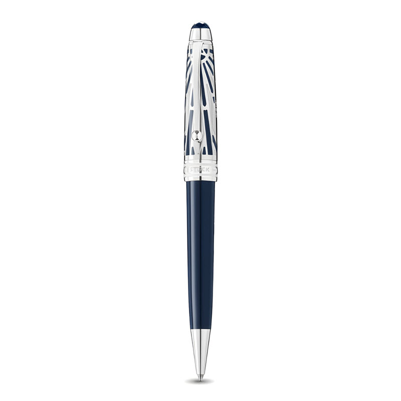 Ngay từ thiết kế bên ngoài, chiếc bút gây ấn tượng bởi sự cân bằng hài hòa giữa cổ điển và hiện đại. Phần nắp phủ kim loại quý được chạm khắc hoa văn tinh xảo kết hợp cùng thân bút resin màu xanh navy đặc trưng tạo nên tổng thể sang trọng nhưng không phô trương. Những đường nét này không chỉ mang giá trị thẩm mỹ mà còn gợi nhắc đến phong cách Art Deco từng ghi dấu trong lịch sử thiết kế, giúp sản phẩm giữ được bản sắc riêng và dễ dàng nhận diện.